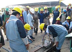 | 溶接トレーニングセンターにて鉄板を切断している様子。現地ワーカーが珍しそうに日本からの来訪者を見ている。 |